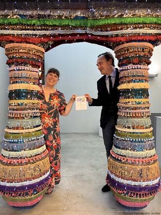 Joana Vasconcelos y Julien de Beaumarchais de Rothschild sostienen la obra en el estudio de la artista